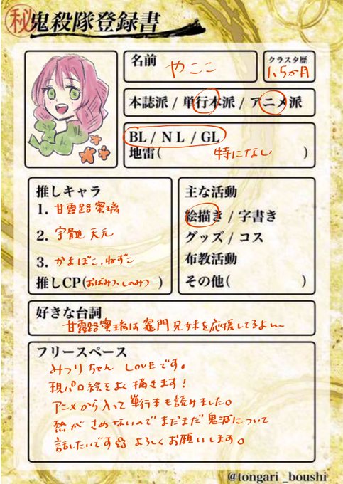 鬼 滅 の 刃 自己 紹介 テンプレ